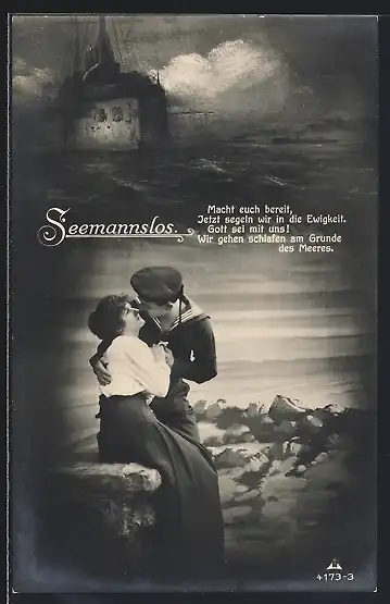 AK Seemannslos, Sinkendes Kriegsschiff, Matrose in Uniform mit seiner Liebsten im Arm