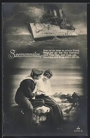 AK Seemannslos, sinkendes Schiff, Matrose und seine Geliebte an der Küste