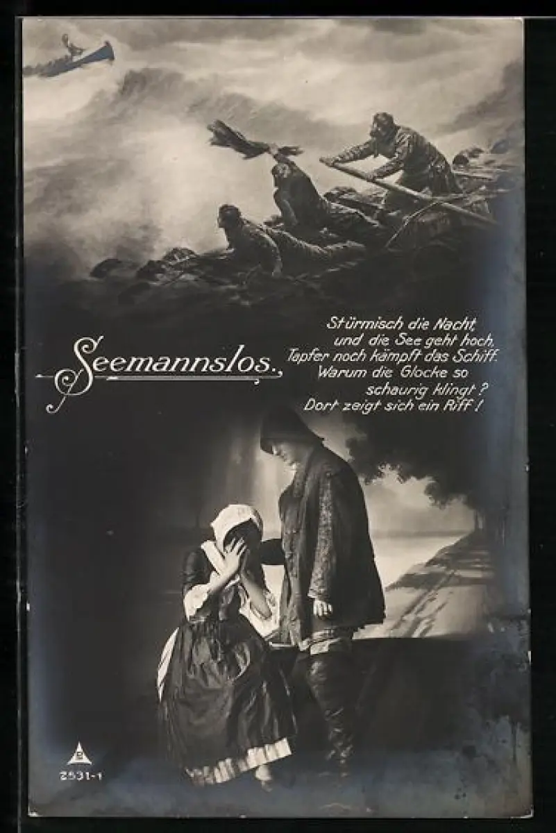 AK Seenotrettung, schiffbrüchige Matrosen auf hoher See, Seemannsfrau in Tränen
