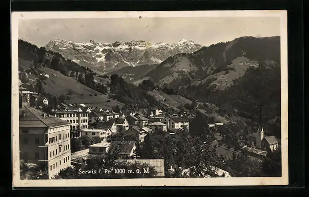 AK Seewis, Totalansicht der Gemeinde mit Alpenpanorama