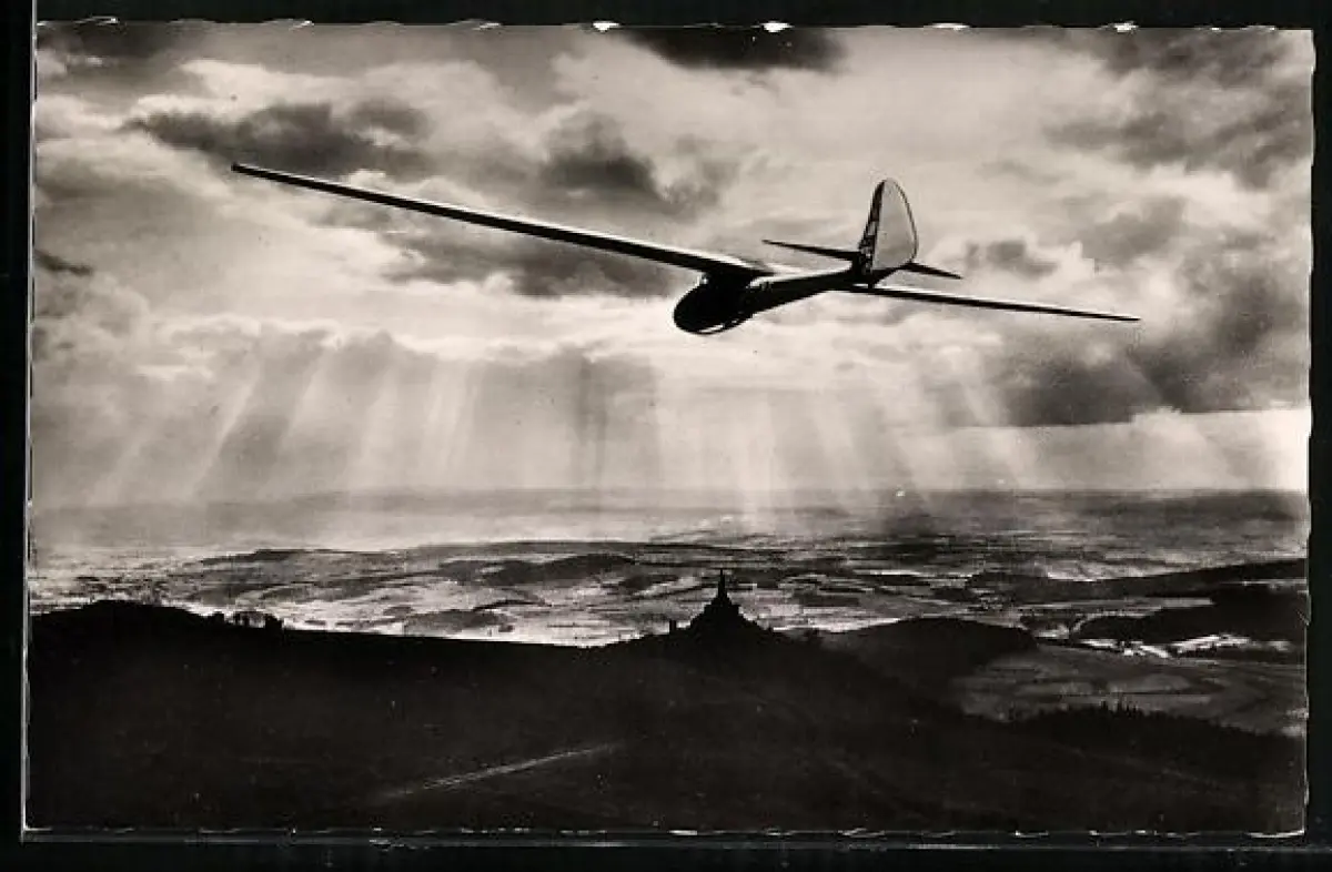AK Segelflug ins Wolkenmeer und Sonnenstrahlen, Segelflugzeug
