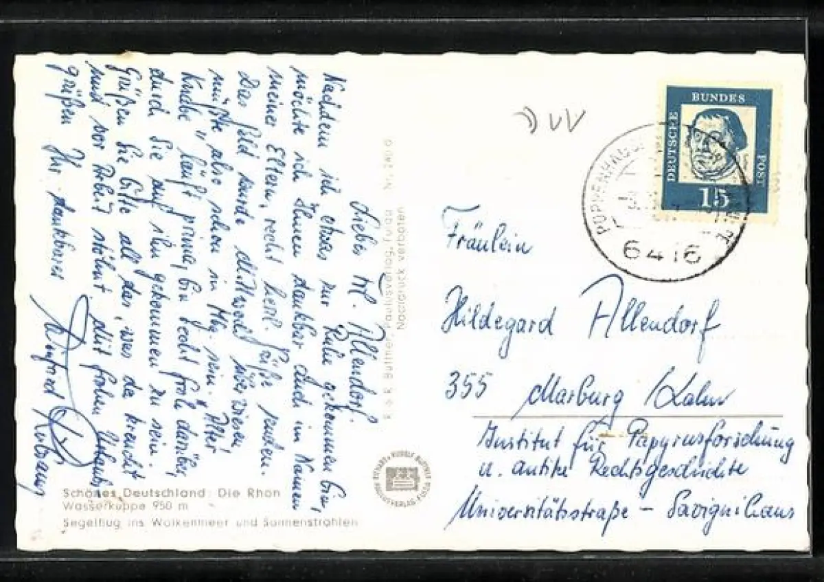 Personenbezogene Daten auf der Rückseite der Karte wurden durch blauen Textmarker unkenntlich gemacht. Die blauen Stellen sind auf die Vorderseite durchgeweicht und wirken sich negativ auf das Postkartenfoto aus