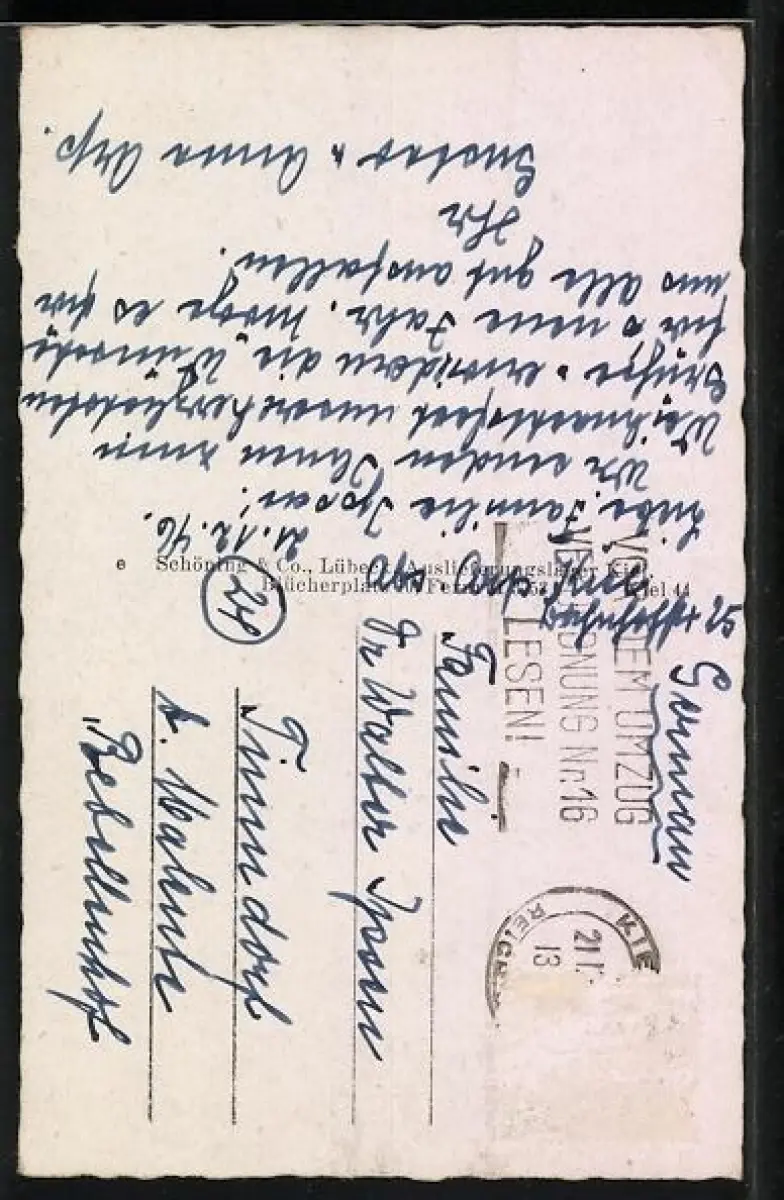 Personenbezogene Daten auf der Rückseite der Karte wurden durch blauen Textmarker unkenntlich gemacht. Die blauen Stellen sind auf die Vorderseite durchgeweicht und wirken sich negativ auf das Postkartenfoto aus