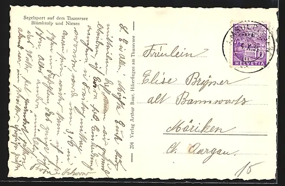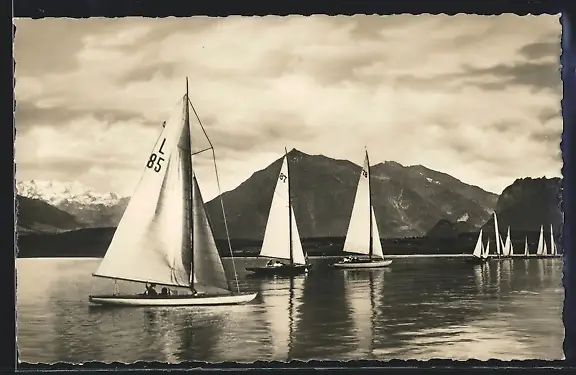 AK Segelsport auf dem Thunersee, Blick auf Blümlisalp und Niesen