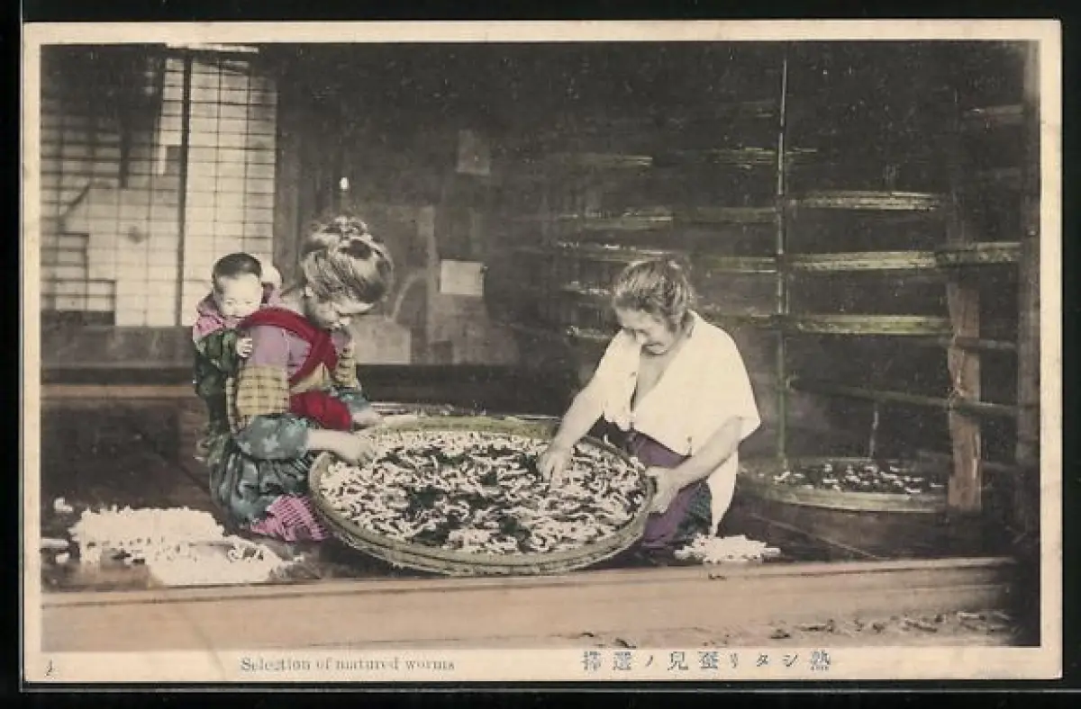 AK Seidenraupenzucht, Frau mit Kind bei der Arbeit, Selection of matured worms