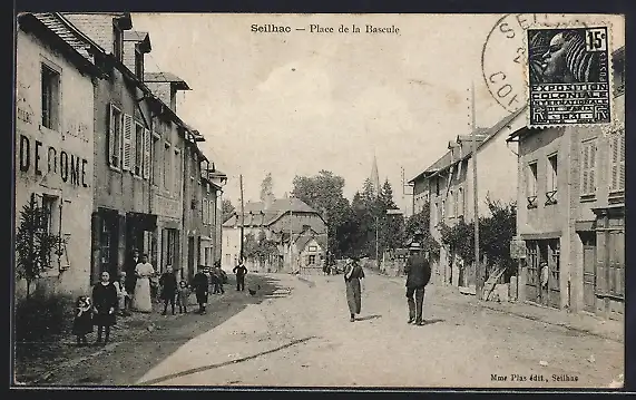 AK Seilhac, Place de la Bascule avec passants et bâtiments alignés