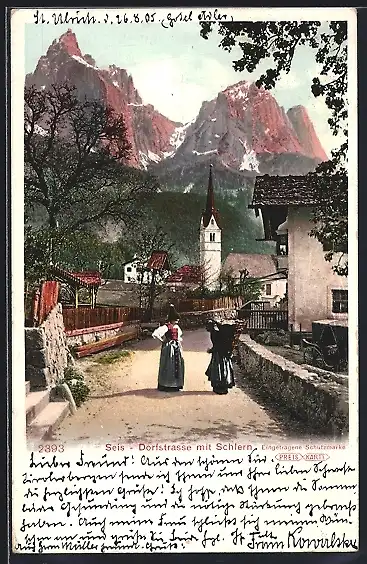 AK Seis, Dorfstrasse mit Kirche und Schlern
