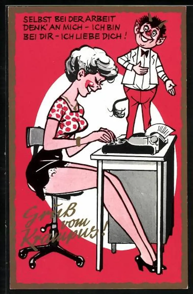 AK Selbst beid er Arbeit..., Krampus steht auf Schreibtisch von Sekretärin