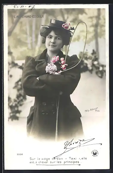 AK Selbstbewusste junge Frau im Mantel mit einer Reitgerte, Emanzipation