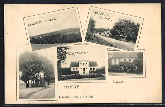 AK Seletice, Hostinec F. Svobody, Skola, Myslivana, Socha Panny Marie