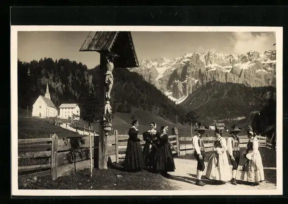 AK Selva in Val Gardena, Ortspartie mit Frauen und Männern in Tracht