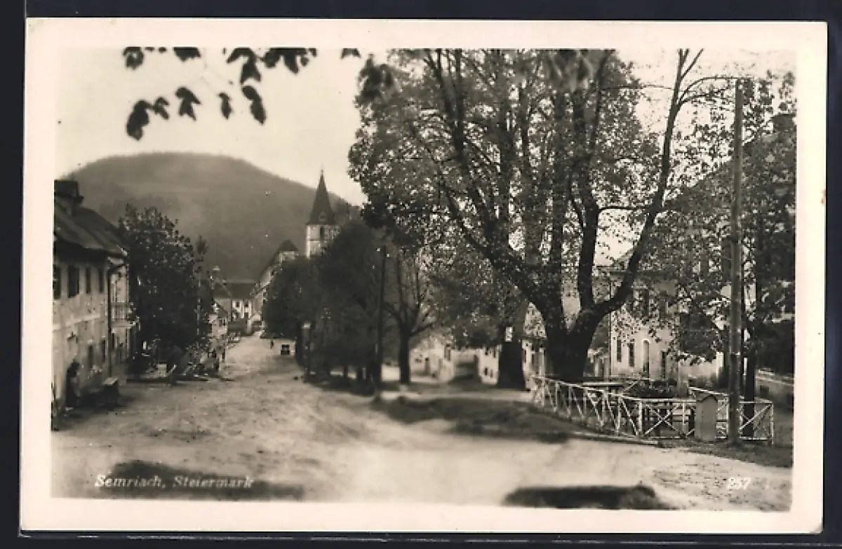 AK Semriach, Steiermark, Strassenpartie mit Blick zum Kirchturm