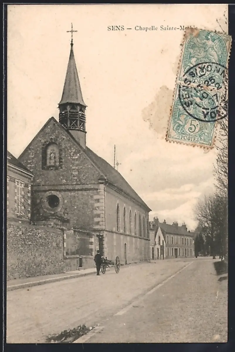 AK Sens, Chapelle Sainte-Mathie avec rue animée