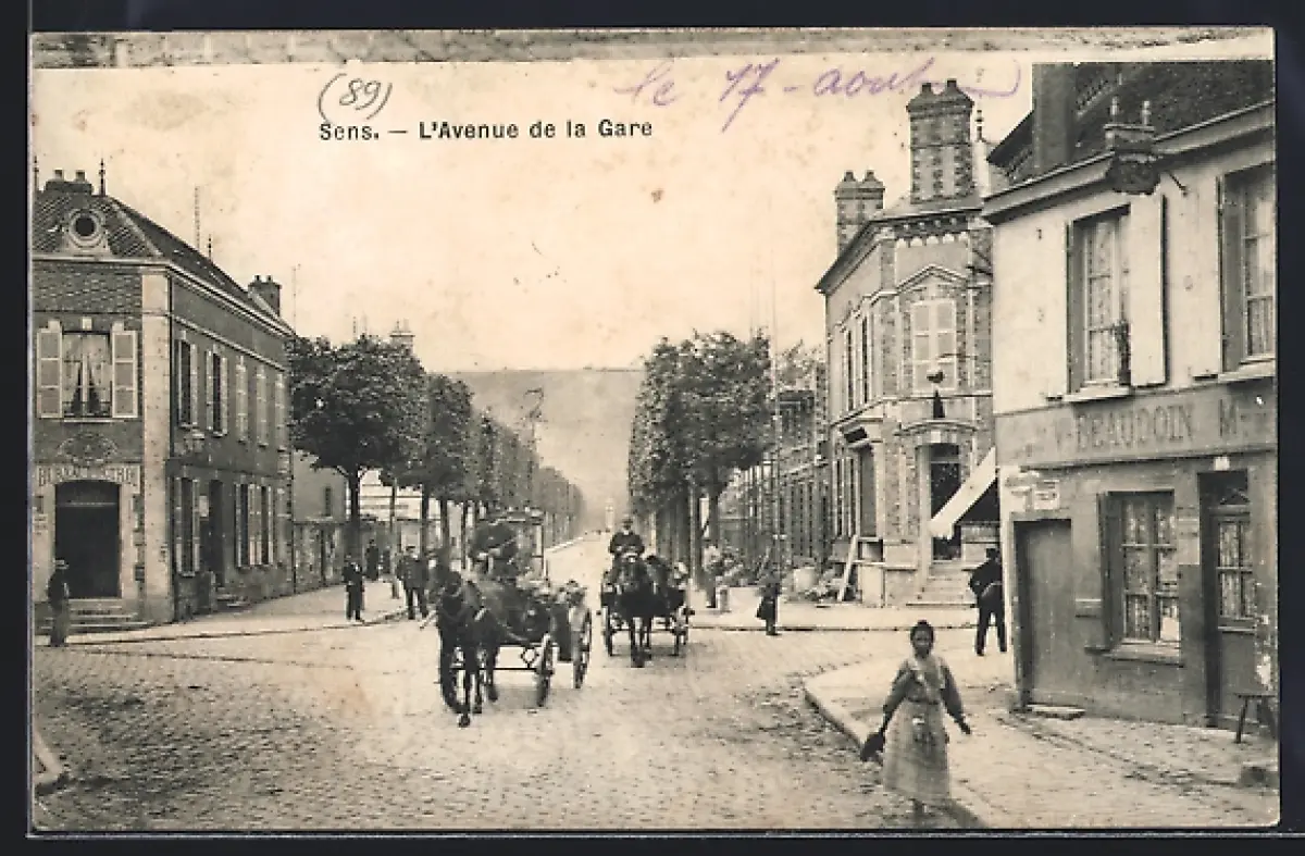 AK Sens, L`Avenue de la Gare avec une calèche et des passants