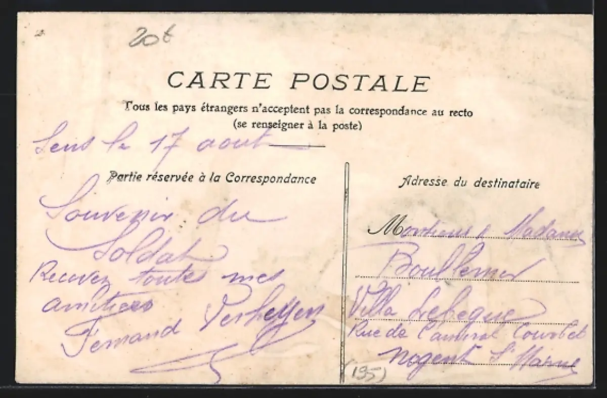 Personenbezogene Daten auf der Rückseite der Karte wurden durch blauen Textmarker unkenntlich gemacht. Die blauen Stellen sind auf die Vorderseite durchgeweicht und wirken sich negativ auf das Postkartenfoto aus