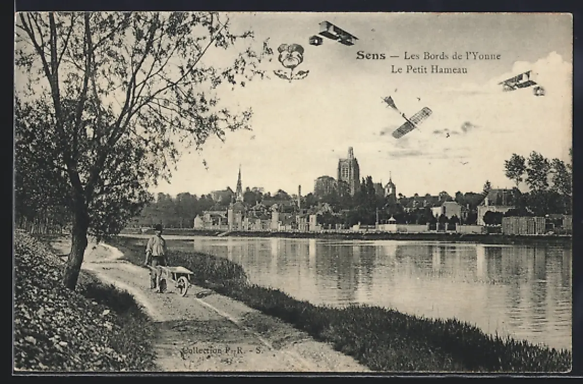 AK Sens, Les Bords de l`Yonne, Le Petit Hameau avec avions en vol