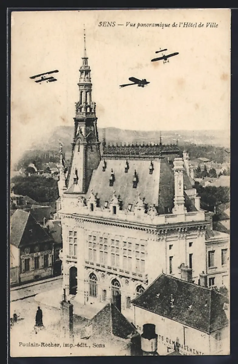 AK Sens, Vue panoramique de l`Hôtel de Ville avec avions en survol