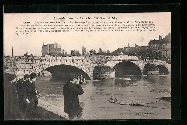 AK Sens, inondations 1910, la crue au vieux pont