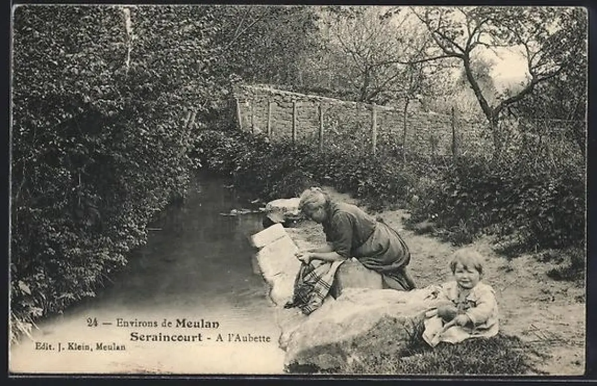 AK Seraincourt, À l`Aubette, scène de lessive au bord de l`eau avec un enfant