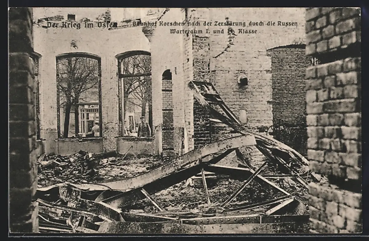 AK Serie: Der Krieg im Osten, Bahnhof Korschen nach der Zerstörung der Russen