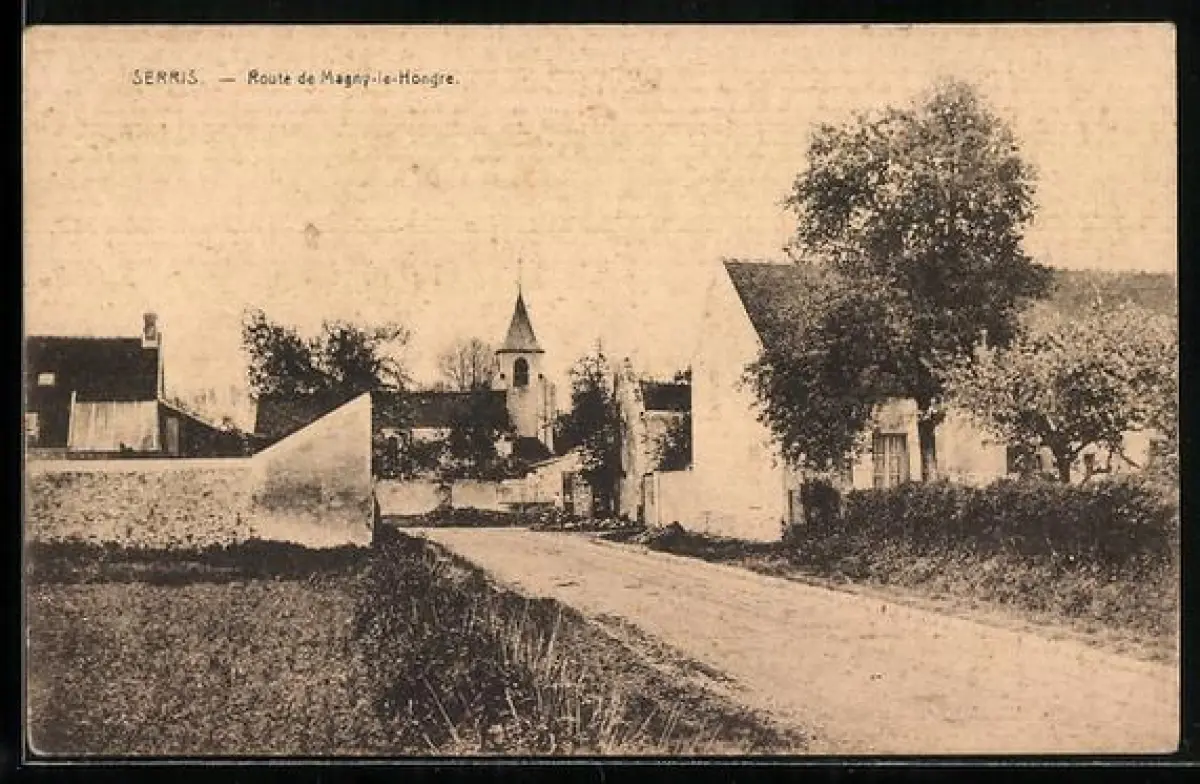 AK Serris, Route de Magny-le-Hongre, vue sur l`église et les maisons rurales