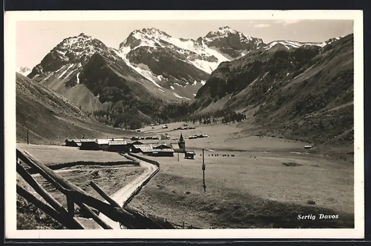 AK Sertig /Davos, Gesamtpanorama mit Gebirgszug