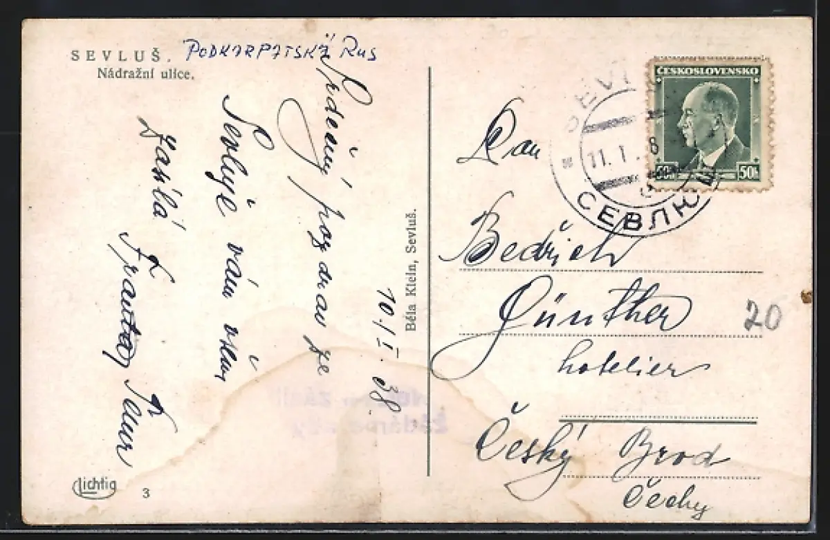 Personenbezogene Daten auf der Rückseite der Karte wurden durch blauen Textmarker unkenntlich gemacht. Die blauen Stellen sind auf die Vorderseite durchgeweicht und wirken sich negativ auf das Postkartenfoto aus
