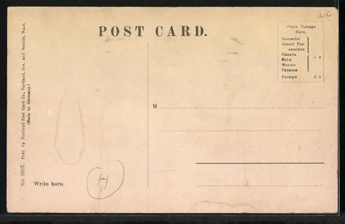 Personenbezogene Daten auf der Rückseite der Karte wurden durch blauen Textmarker unkenntlich gemacht. Die blauen Stellen sind auf die Vorderseite durchgeweicht und wirken sich negativ auf das Postkartenfoto aus