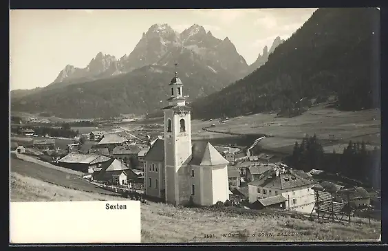 AK Sexten, Ortspartie mit Kirche, um 1900