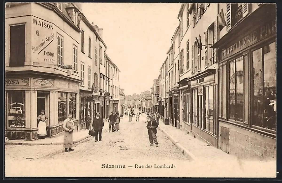 AK Sézanne, Rue des Lombards animée avec passants et boutiques