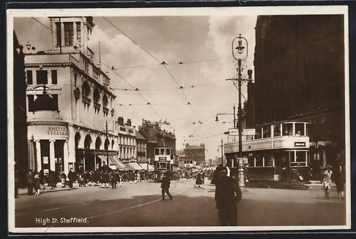 AK Sheffield, High Street, Strassenbahn