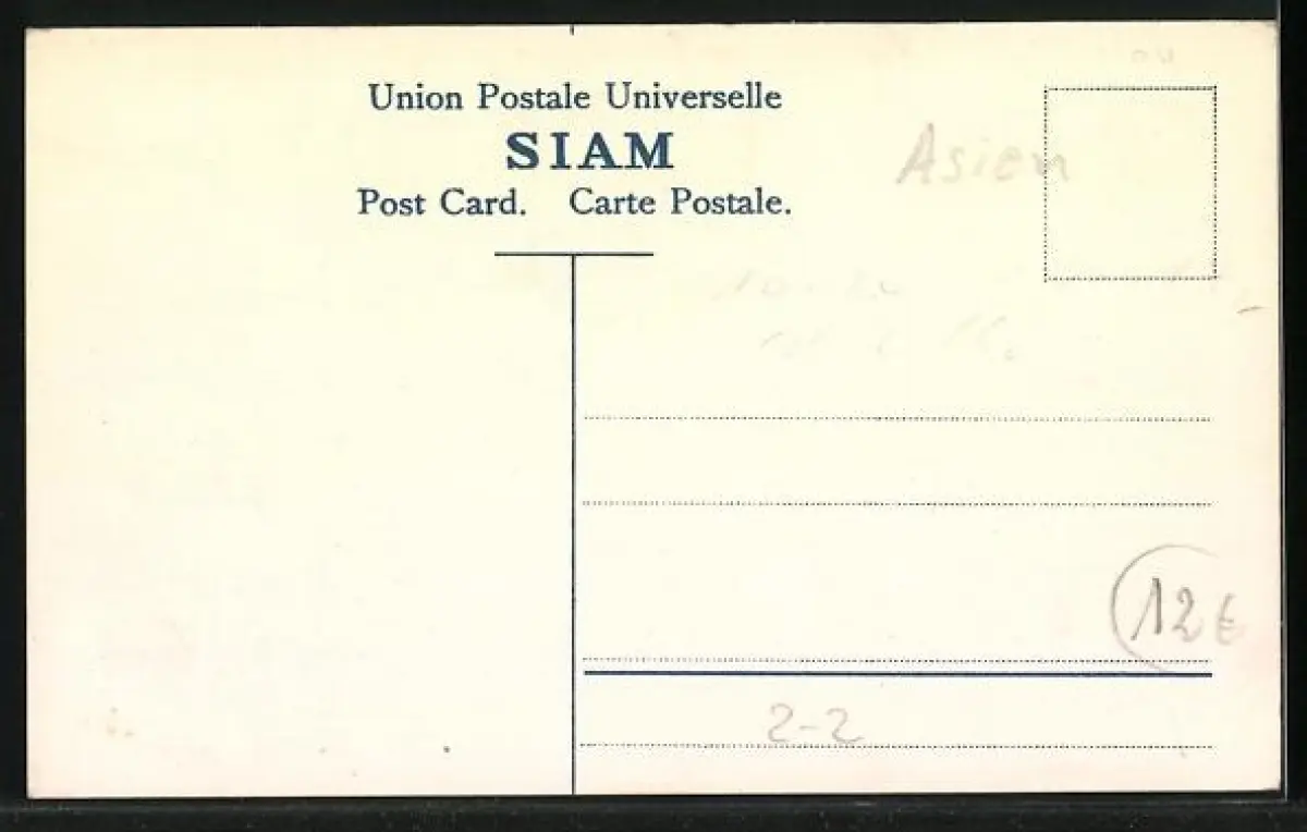 AK Siam, Briefmarken verschiedener Werte, Wappentier Elefant, Landkarte der Region