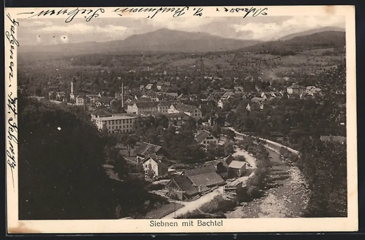 AK Siebnen, Ortsansicht mit Bachtel und Strasse aus der Vogelschau