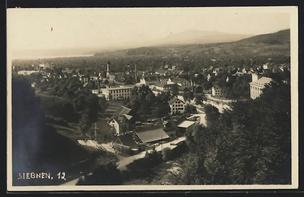 AK Siebnen, Teilansicht mit Strasse und Fernblick aus der Vogelschau