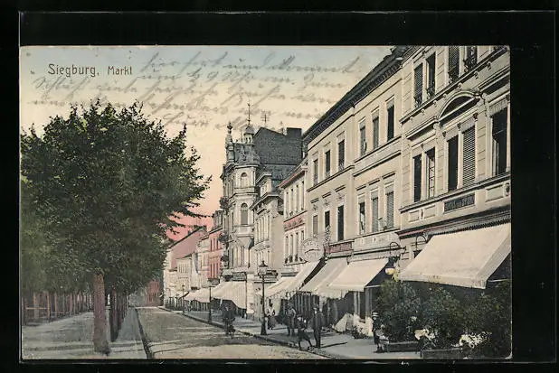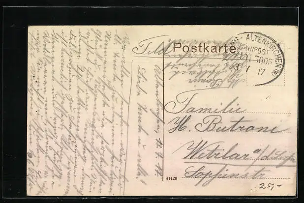 Personenbezogene Daten auf der Rückseite der Karte wurden durch blauen Textmarker unkenntlich gemacht. Die blauen Stellen sind auf die Vorderseite durchgeweicht und wirken sich negativ auf das Postkartenfoto aus