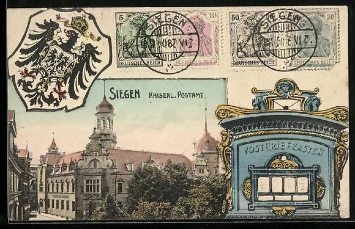 AK Siegen, Kaiserliches Postamt, Passepartout mit Briefkasten und Wappen