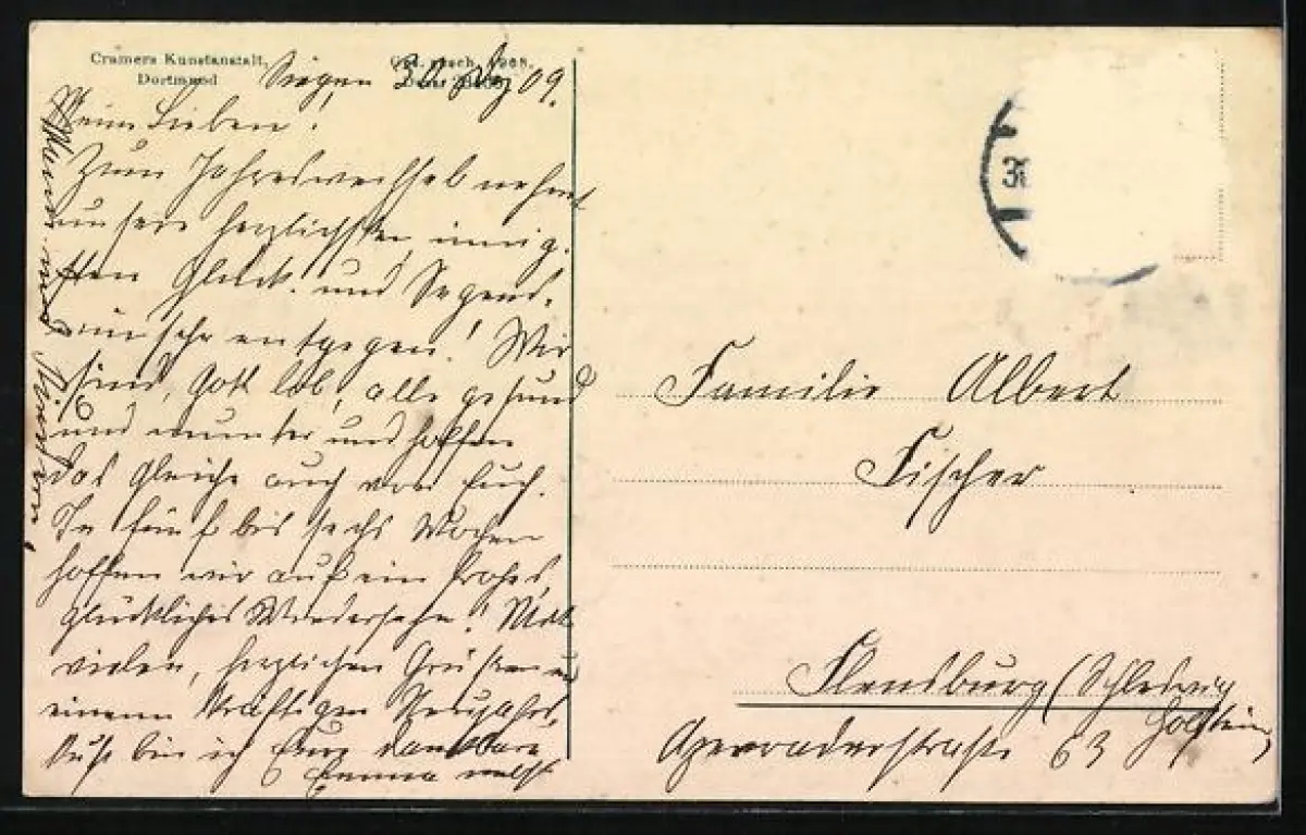 alte Ansichtskarte, gelaufen, Briefmarke entfernt, rückseitig Oberflächenschaden, guter Zustand