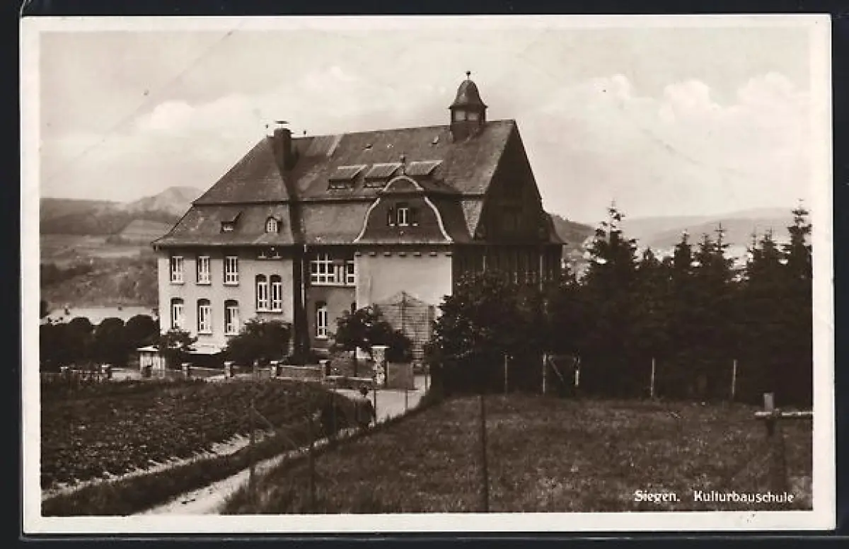 AK Siegen, Kulturbauschule mit Zufahrt und Bergpanorama