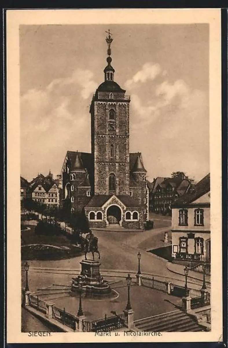 AK Siegen, Markt, Nikolaikirche u. Reiterdenkmal aus der Vogelschau