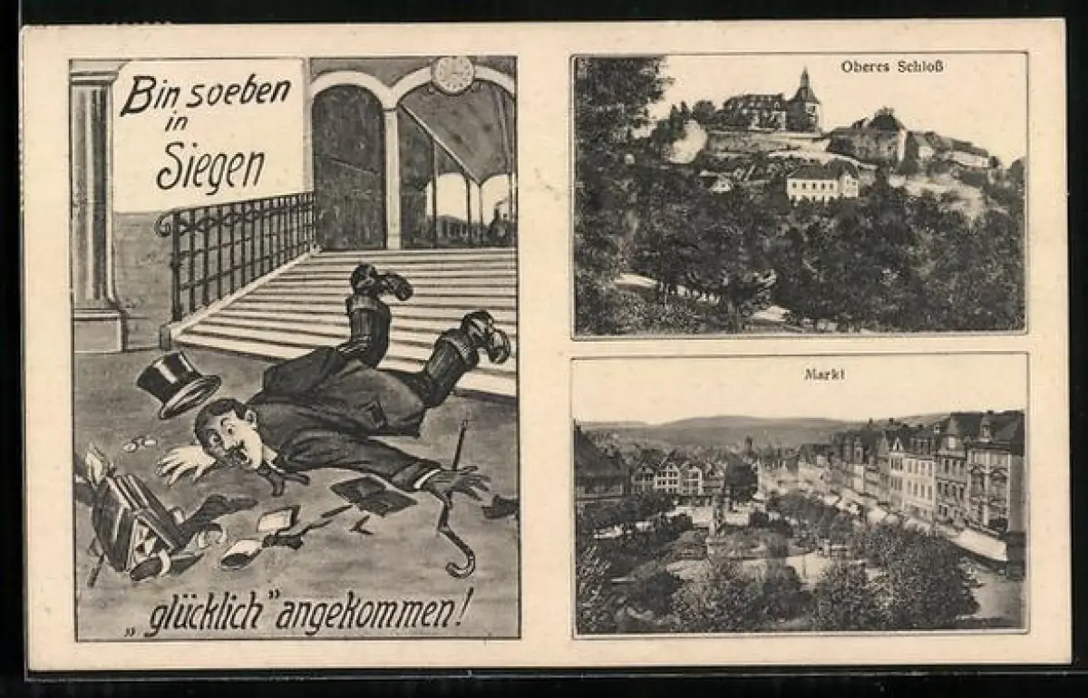 AK Siegen, Oberes Schloss, Markt, Mann ist auf Treppe ausgerutscht