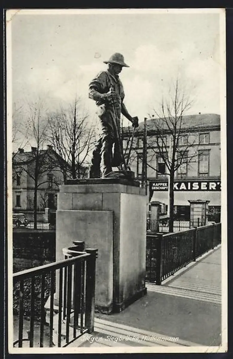 AK Siegen, Siegbrücke, Hüttenmann-Denkmal, Kaiser`s Geschäft