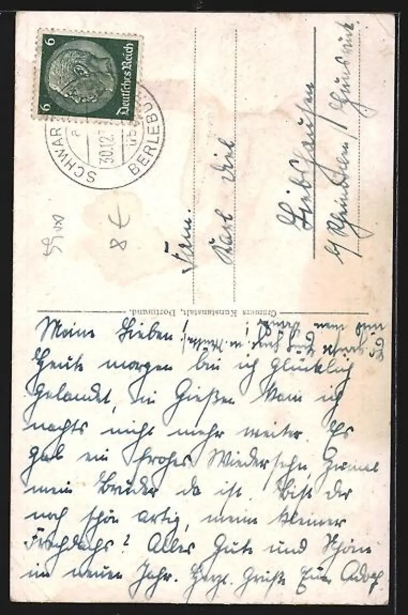 Personenbezogene Daten auf der Rückseite der Karte wurden durch blauen Textmarker unkenntlich gemacht. Die blauen Stellen sind auf die Vorderseite durchgeweicht und wirken sich negativ auf das Postkartenfoto aus