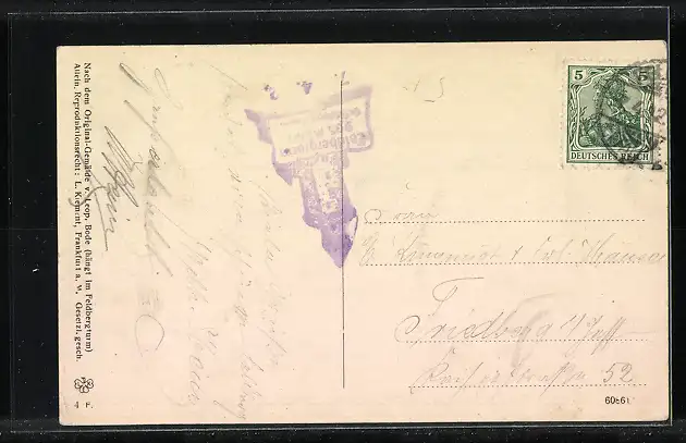 Personenbezogene Daten auf der Rückseite der Karte wurden durch blauen Textmarker unkenntlich gemacht. Die blauen Stellen sind auf die Vorderseite durchgeweicht und wirken sich negativ auf das Postkartenfoto aus