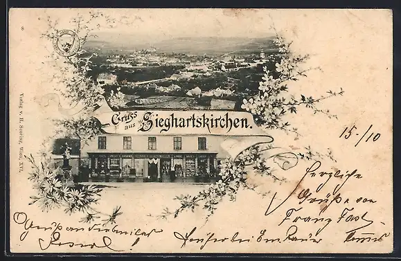 AK Sieghartskirchen, Geschäft von Heinrich Ockermüller und Totalansicht