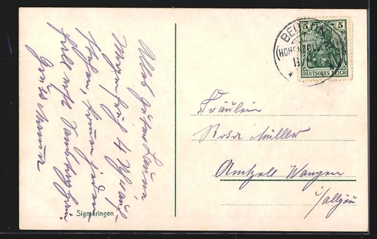Personenbezogene Daten auf der Rückseite der Karte wurden durch blauen Textmarker unkenntlich gemacht. Die blauen Stellen sind auf die Vorderseite durchgeweicht und wirken sich negativ auf das Postkartenfoto aus