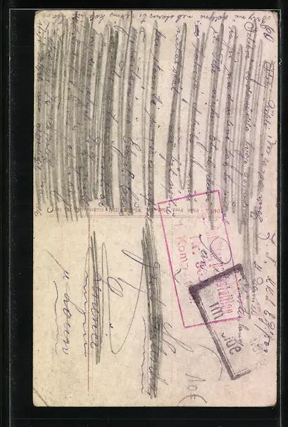 Personenbezogene Daten auf der Rückseite der Karte wurden durch blauen Textmarker unkenntlich gemacht. Die blauen Stellen sind auf die Vorderseite durchgeweicht und wirken sich negativ auf das Postkartenfoto aus