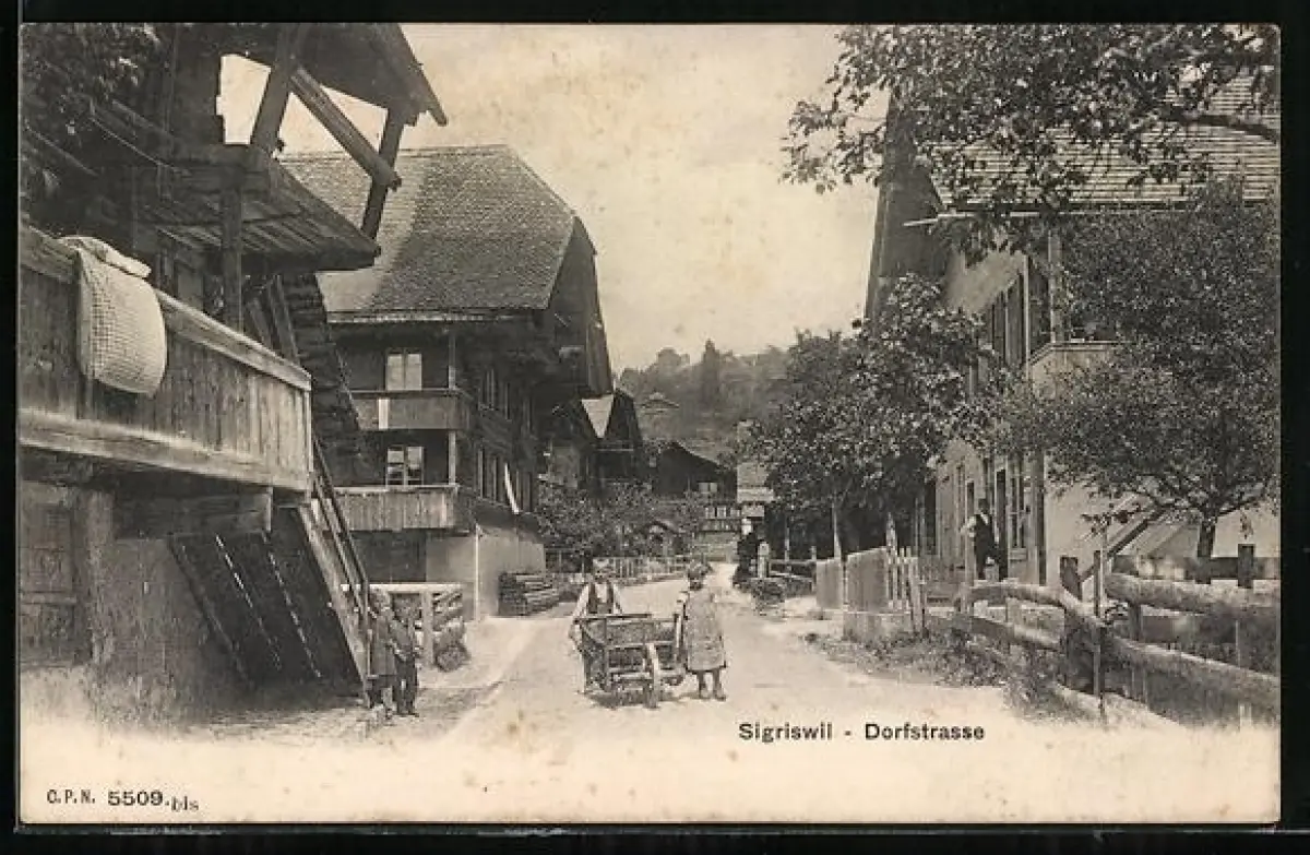 AK Sigriswil, Strassenpartie mit Gebäudeansicht und Kindern
