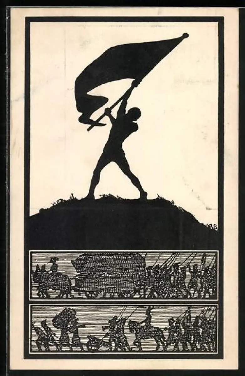 AK Silhouette eines Fahnenträgers und marschierender Heereszug