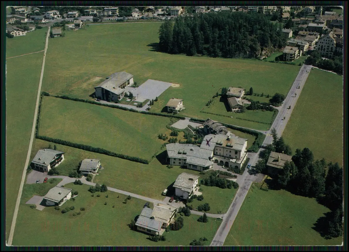 Weitläufige Luftaufnahme über die typische Engadiner Wiesenlandschaft mit einzelnen Wohnhäusern, Freiflächen, Waldstreifen und klar erkennbaren Zufahrtswegen. Mittig das markierte Hauptgebäude des Silserhofs, umgeben von mehreren Nebengebäuden.