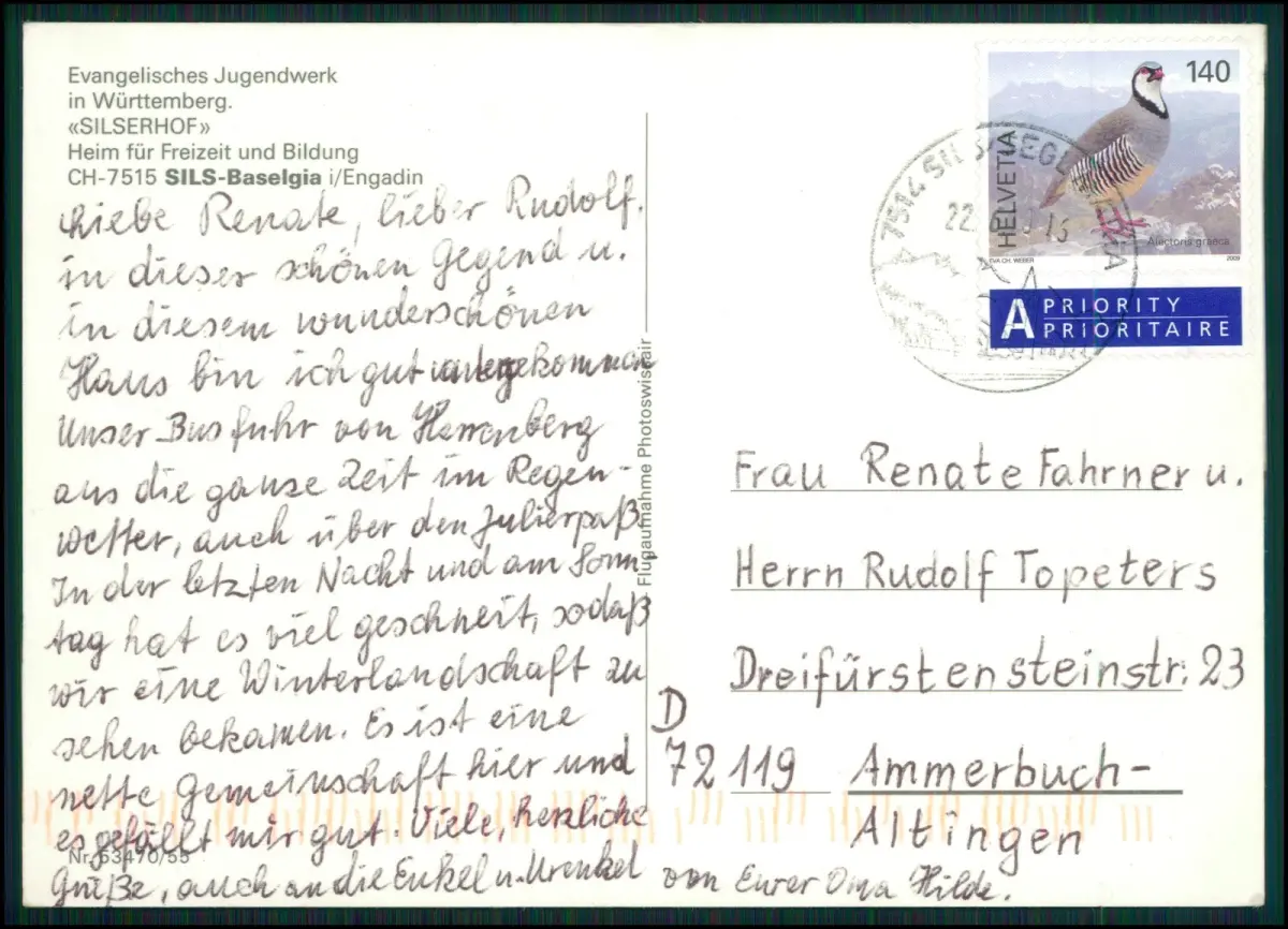 Absenderangabe: Evangelisches Jugendwerk Württemberg – Silserhof, Sils Baselgia